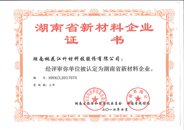 2017年7月,湖南省經(jīng)濟(jì)和信息化委員會(huì)、湖南省統(tǒng)計(jì)局為湖南桃花江竹材科技股份有限公司正式頒發(fā)“湖南省新材料企業(yè)”證書(證書編號(hào):HNXCL2017075)。湖南省新材料企業(yè)的認(rèn)定,標(biāo)志著湖南桃花江竹材科技在新型竹材領(lǐng)域的成績得到國家認(rèn)可與支持,是一項(xiàng)具有含金量的突破性榮譽(yù)。作為中國竹業(yè)龍頭企業(yè),湖南桃花江竹材科技一直走在新型竹材研發(fā)、運(yùn)用和推廣的前沿,為全球竹產(chǎn)業(yè)的發(fā)展持續(xù)貢獻(xiàn)力量。